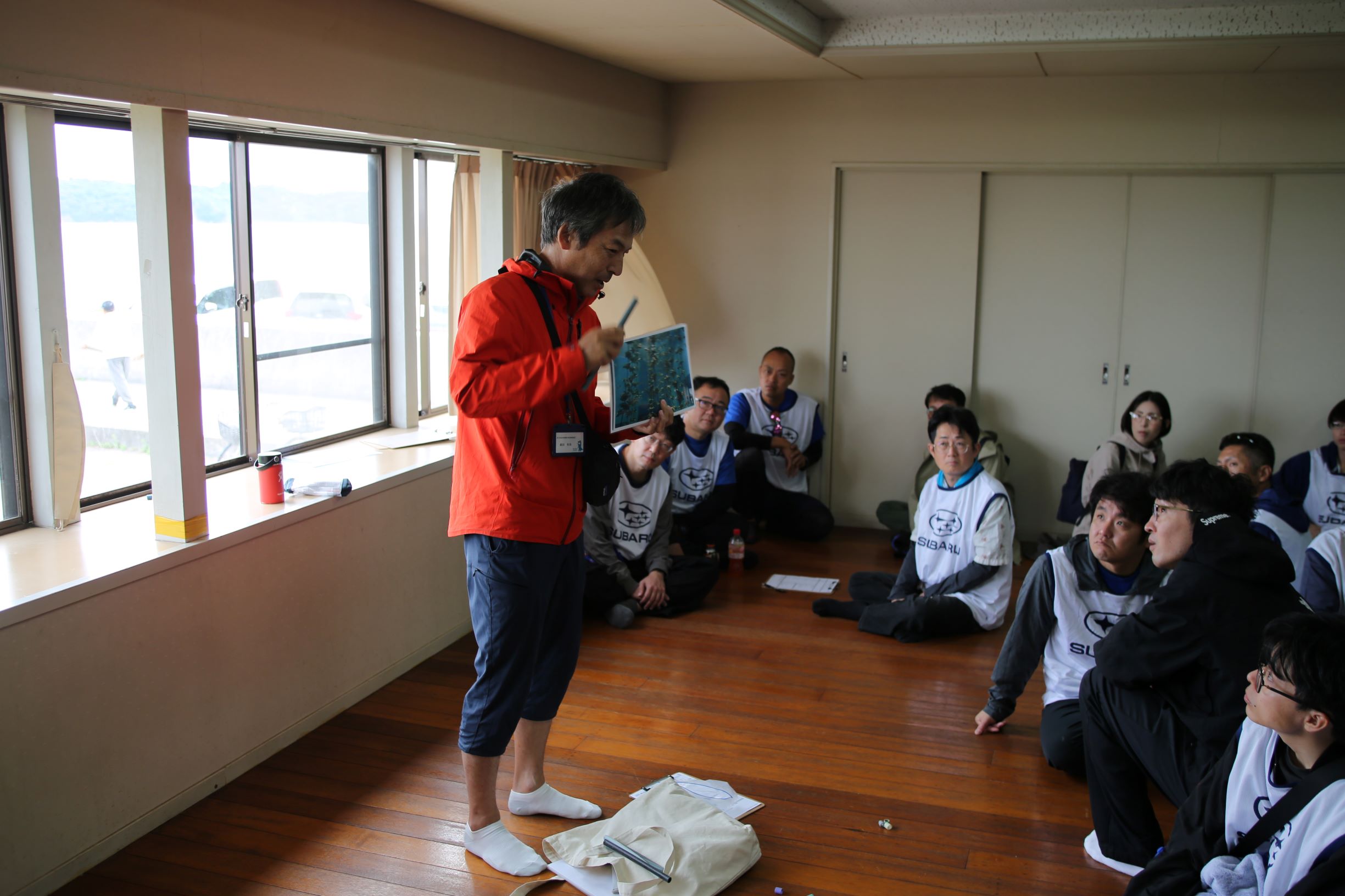 最初はグループ分けとオリエンテーション。社員同士なので知った人がほとんどですが、改めて自己紹介。グループ内の役割を決めます。今回の目的とどのようなごみがあるかを森田リーダーが説明。牡蠣の養殖に使っているプラスチックのことや、ちょっと驚く注射器のお話など、みんな興味深く聞いていました。